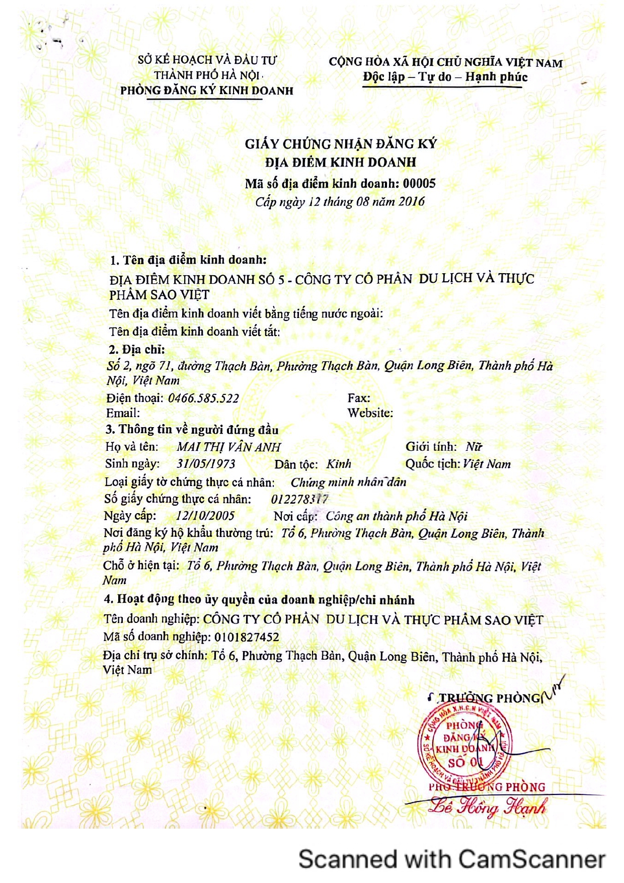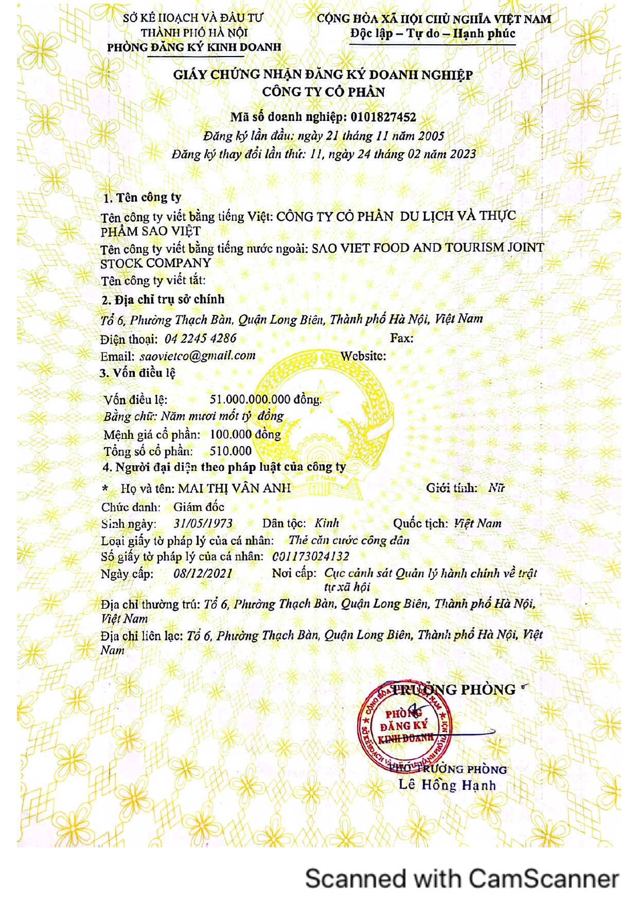 Chính thức thành lập Công ty Cổ phần Du lịch và Thực phẩm Sao Việt với mã số thuế 0101827452.